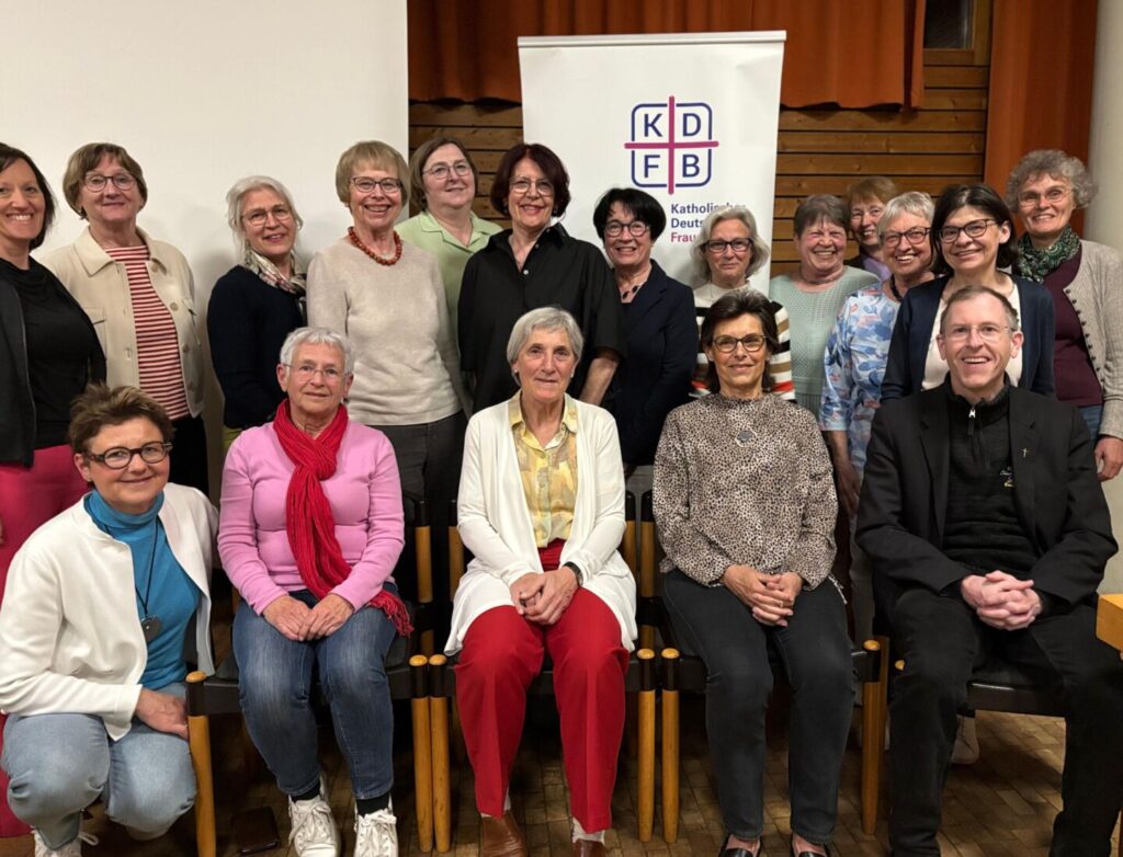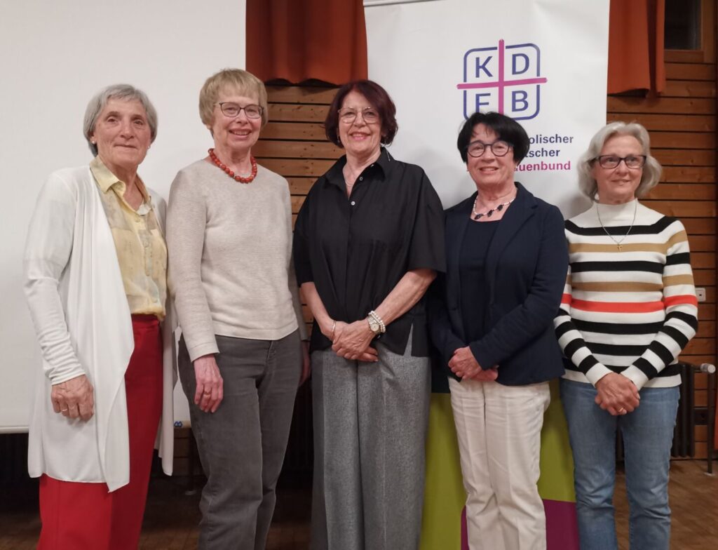 Alle Ämter wurden besetzt: Vorstandschaft, bestehend aus 5 Personen, Beisitzerinnen, Gruppenleiterinnen und geistlicher Beirat Stadtpfarrer Gugler. Vorstandsteam von links: Rita Widmann, Petra Jarde, Rosina Zwetschke, Ingrid Hausmann, Gabi Anneser.